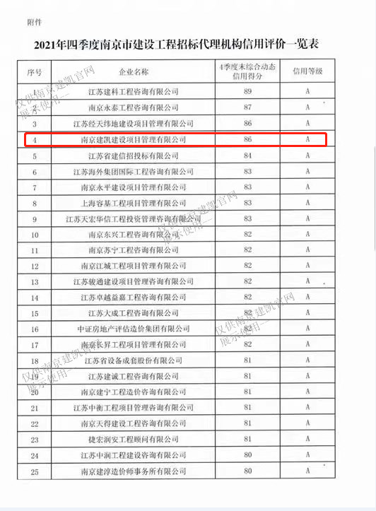 热烈祝贺我司招标代理在“2021年四季度南京市建设工程招标代理机构信用评价”中荣获A级。