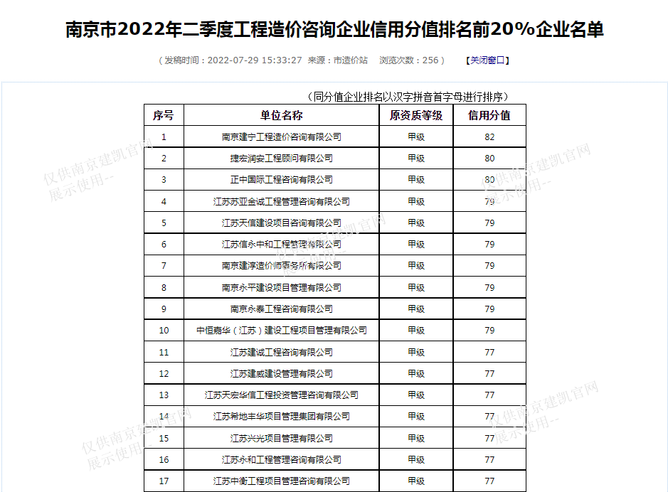 恭喜我司造价部入选“南京市2022年二季度工程造价咨询企业信用分值排名前20%企业名单”