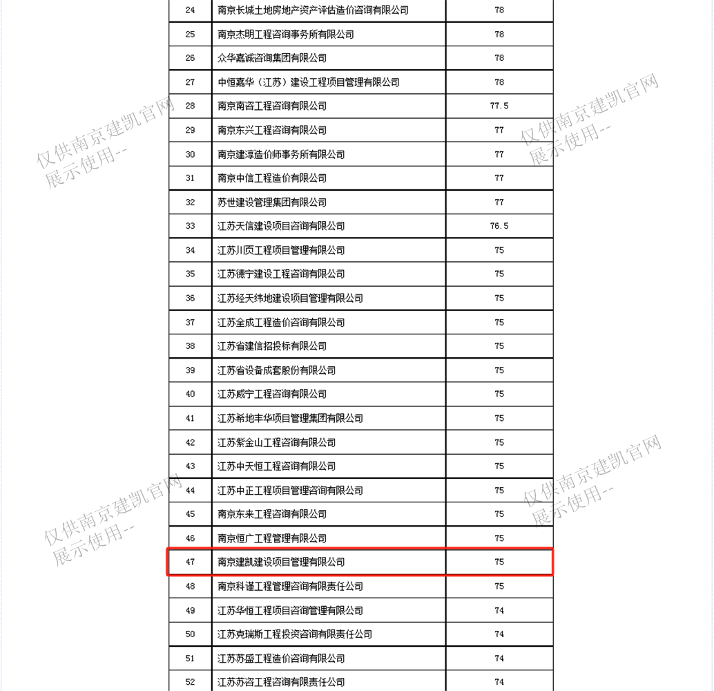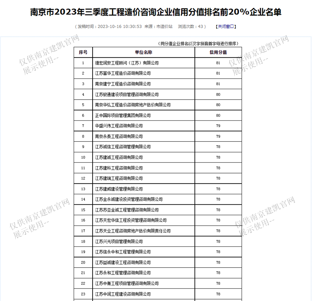 恭喜我司入选“南京市2023年三季度工程造价咨询企业信用分值排名前20%企业名单”