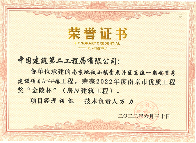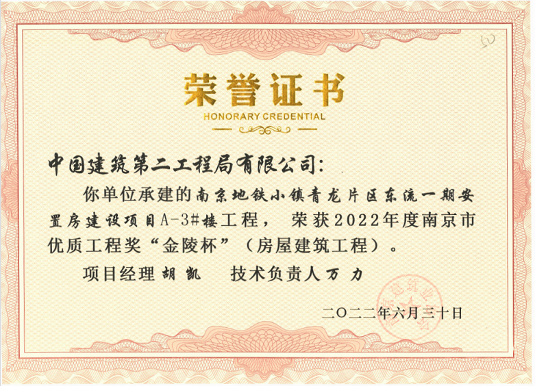 (2022年6月30日)地铁小镇青龙片区东流一期安置房建设项目A-3#楼、A-4#楼荣获《2022年度南京市优质结构“金陵杯”》奖